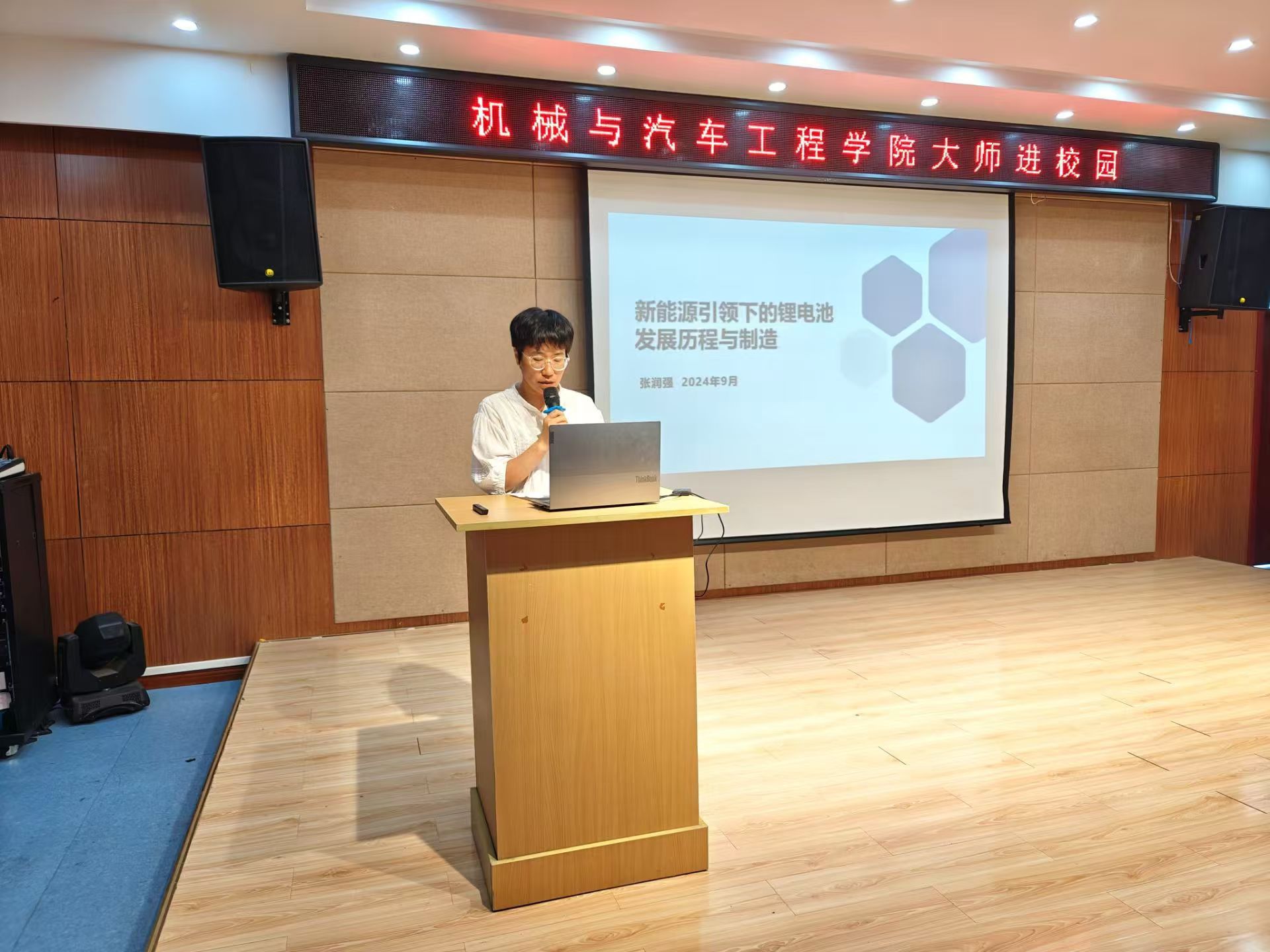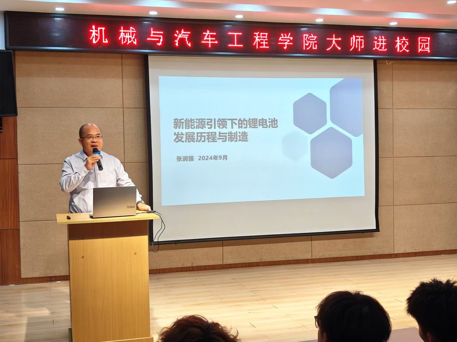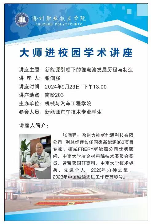 9 23 日,机械与汽车工程学院组织“大师进校园”学术讲座,邀请滁州力神新能源科技有限公司副总经理张润强来校,为2024级新能源汽车技术专业的学生开展主题为“新能源引领下的锂电池发展历程与制造”学术讲座。新能源汽车技术专业带头人杨诚、辅导员刘旭冉、全体2024级新能源汽车技术专业学生参加讲座,会议由学院党总支副书记吴佳佳主持。