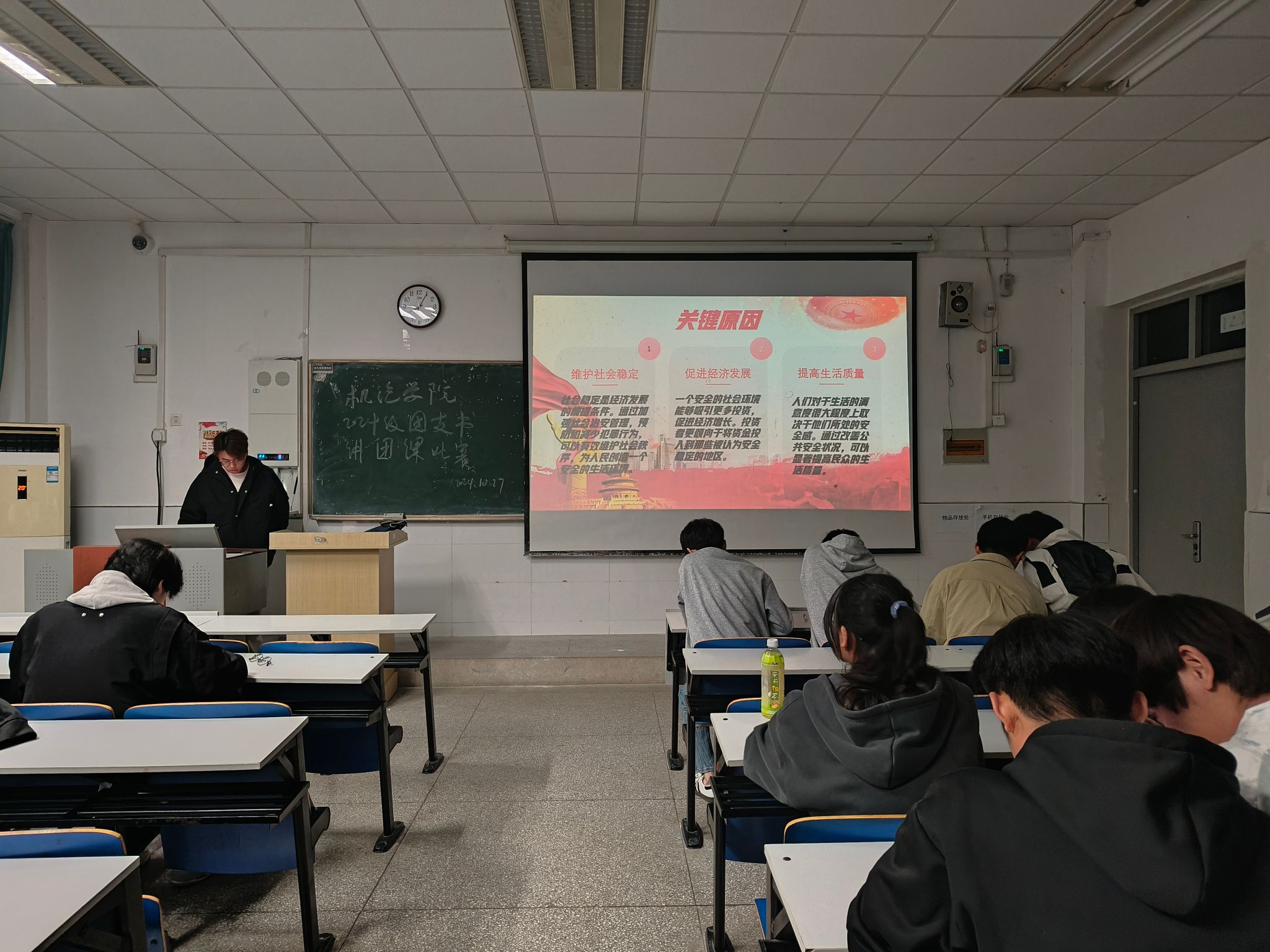 各班级团支书通过精心准备的 PPT 展示和生动的讲解,举例准确、观点清晰、重点突出。展示对党的二十届三中全会精神的学习、思考,彰显了我院团支书们的思想觉悟,展现了新时代青年饱满的热情和更加坚定的信念。
