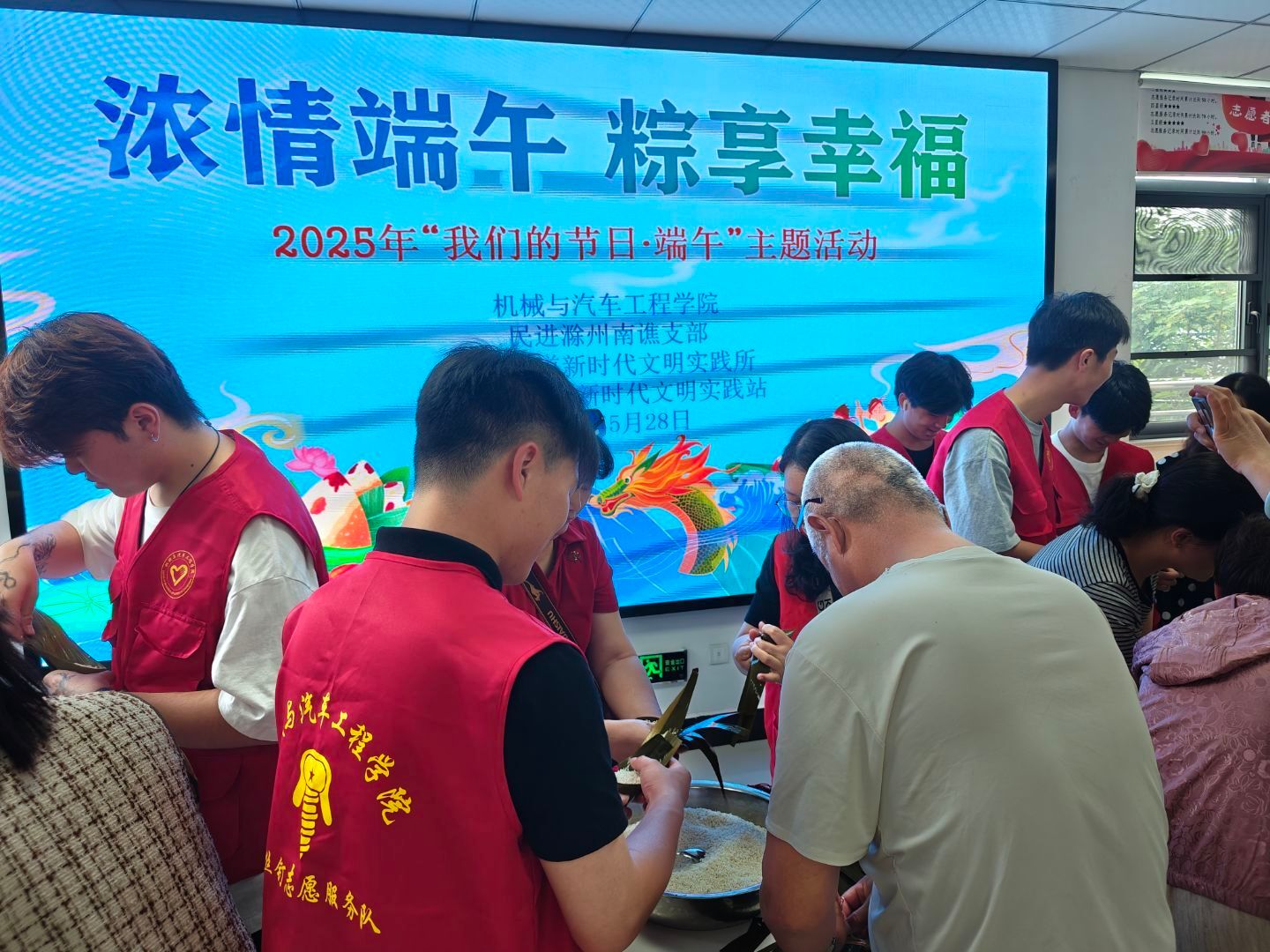 端午佳节,粽叶飘香。为弘扬中华优秀传统文化,丰富社区居民的精神文化生活,增进邻里之间的感情,2025年5月28日,机械与汽车工程学院学生代表赴湖心路社区参加了一场以“浓情端午,粽享幸福”为主题的端午节活动,其中众多居民热情参与。
