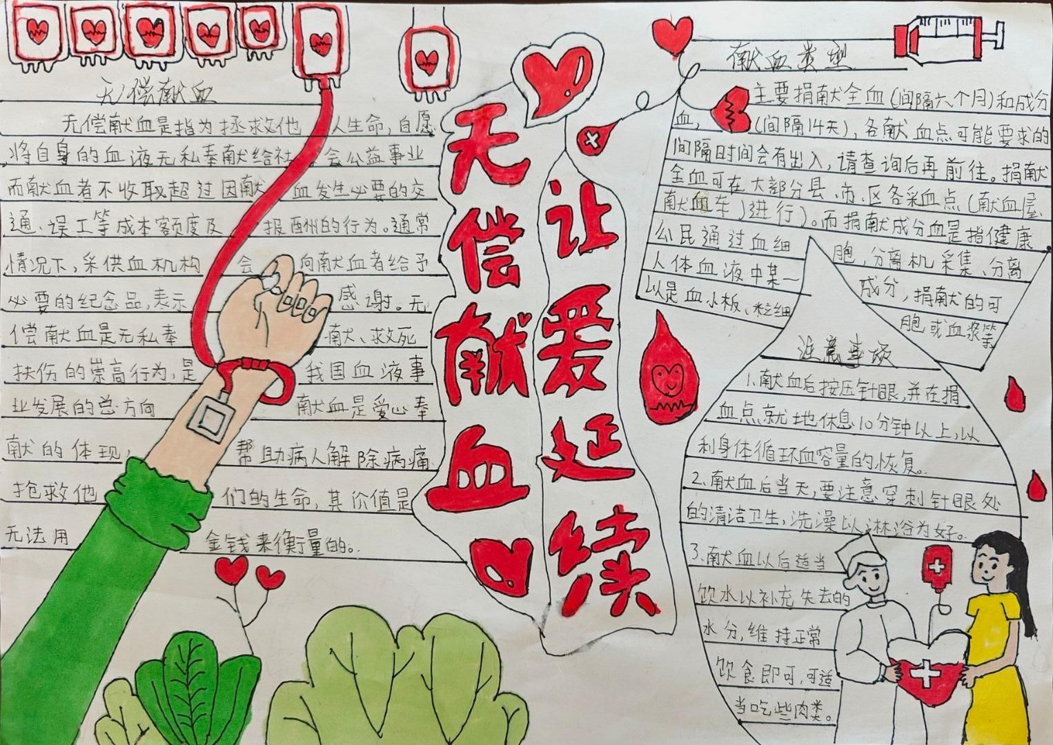 活动期间,同学们充分发挥想象力与创造力,将对无偿献血的理解融入色彩与线条之中。一幅幅精美的手抄报上,既有鲜红的爱心血液、“生命接力”的插画,也有通俗易懂的献血知识科普,如“献血对身体的益处”“血液在医疗救治中的重要性”等文字说明。