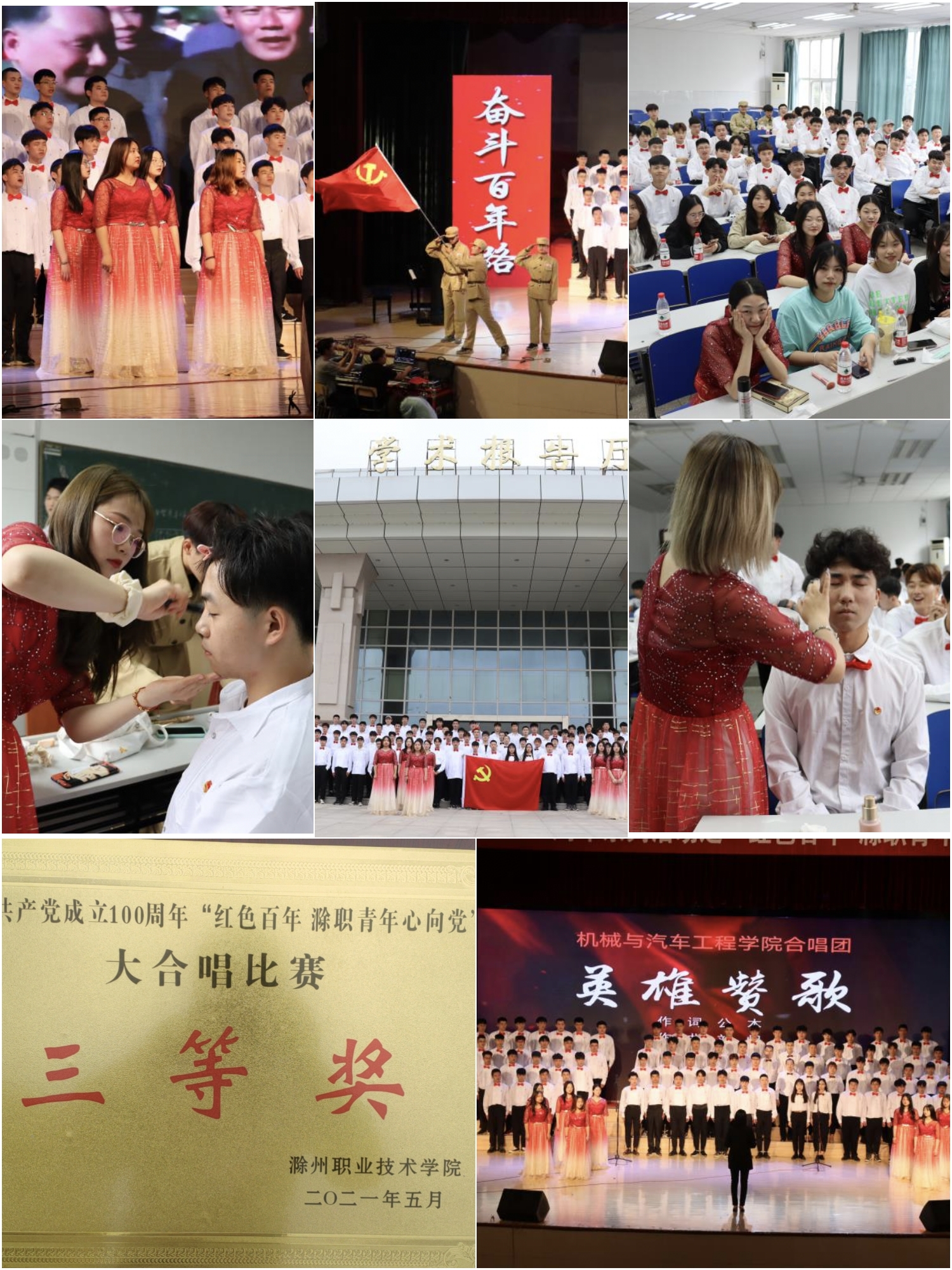 迎建党百年,展青春风采。2021年5月12日,Beat365唯一官方网站庆祝中国共产党成立100周年系列活动之“红色百年,滁职青年心向党”大合唱比赛在学校学术报告厅举行。机械与汽车工程学院合唱团热情洋溢,用歌声尽情抒发着热爱党和祖国的情怀,表示对革命先烈的缅怀和崇敬,并获得三等奖。