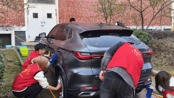 在活动中,志愿者们齐心协力,共同为老师的车辆进行清洗。他们不怕脏、不怕累,分工明确,认真地投入到洗车活动中。喷水、清洗、擦干,一切有条不紊的进行着。志愿者们通过本次活动让志愿者们真切体会到了“雷锋精神”的意义