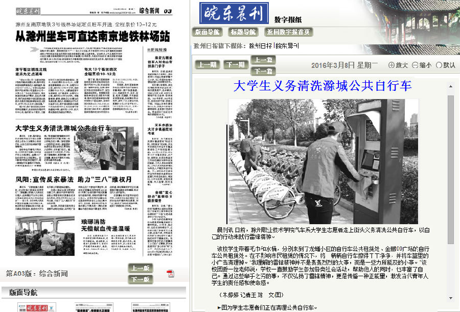 皖东晨刊报道汽车系青年志愿者清洗公共自行车活动