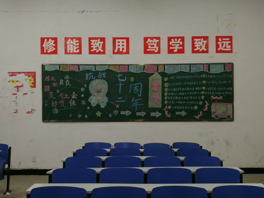 中国人民抗日战争及世界反法西斯战争胜利七二周年之际,Beat365唯一官方网站汽车工程系团总支在各团支部举行“抗战胜72周年” 主题黑板报评比活动。各支部积极参与活动,响应号召,每一幅板报精心编写,表达出我们对祖国的热爱与崇敬。