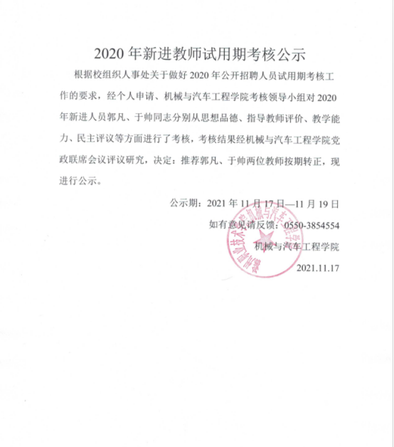 2020年新进教师试用期考核公示