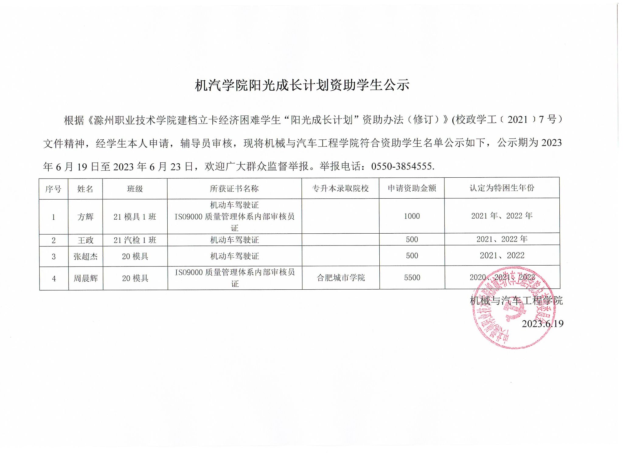 机械与汽车工程学院2023年阳光成长计划资助学生公示