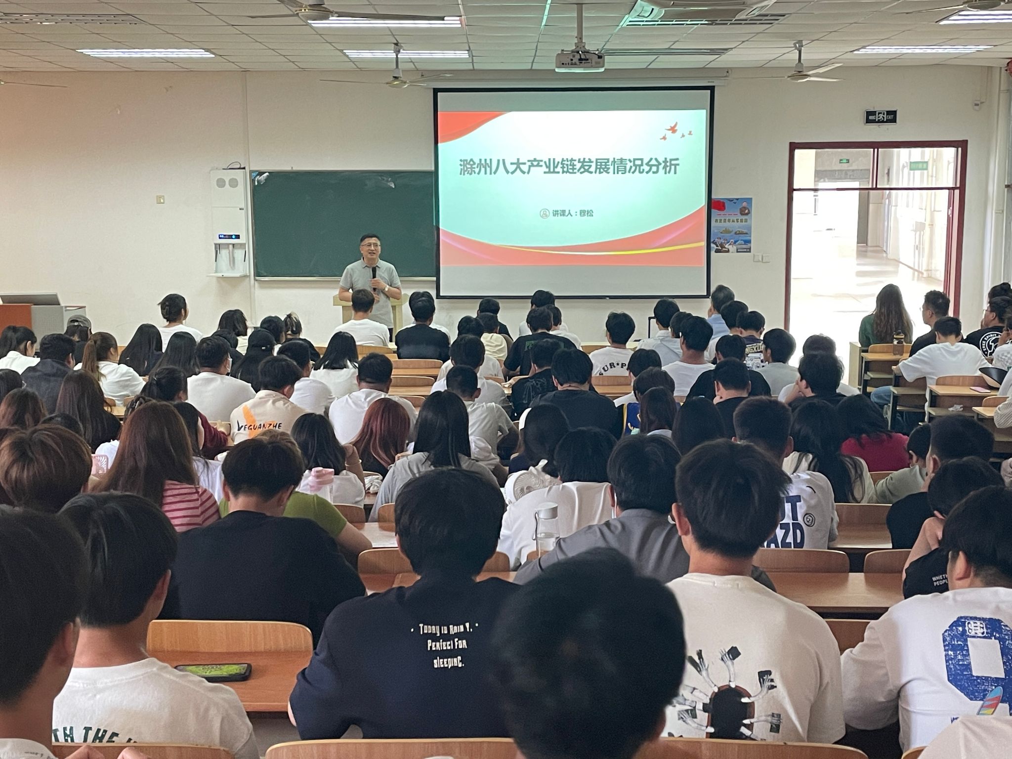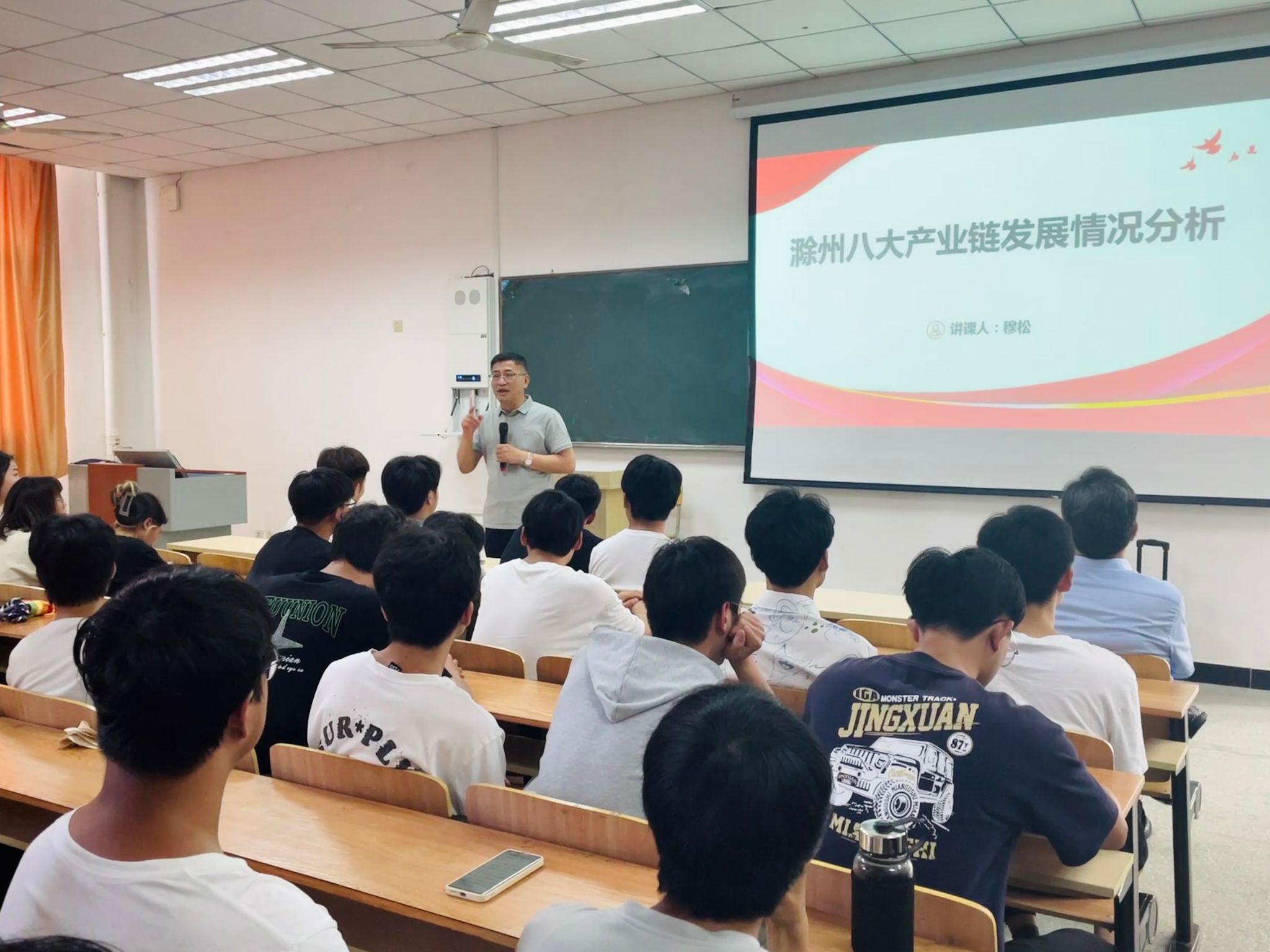穆松以《滁州经济发展形势分析暨就业创业政策宣讲》为题,以滁州经济发展形势为切入点,详细介绍了滁州市八大产业总体布局、产业链发展情况、“双招双引”主要做法,以详实的数据向同学们展示了滁州在全面加快现代化建设新征程上取得的优异成绩。
