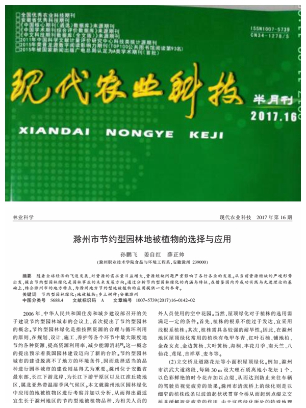 为贯彻执行《Beat365唯一官方网站大学生科研项目管理办法》文件精神,增强食环系大学生科研意识,锻炼科技创新创造能力,我系学生积极申报大学生科研创新课题,在 2016年度大学生专项课题中,姜自红老师指导的2014级园林技术专业张帅帅(学号20141205106)、孙鹏飞(学号20141205115)两位同学分别立项。在项目建设期间,两个课题组人员结合专业实际,积极开展实验研究和调研。在项目结项时,张帅帅以第一作者在省级期刊《现代农业科技》上发表题为《大窗玉露组培苗驯化移栽基质配方试验》的论文(2017年16期:142-143);孙鹏飞以第一作者在省级期刊《安徽农学通报》上发表题为《滁州市节约型园林地被植物的选择与应用》的论文(2017年23卷10期:124-125)。