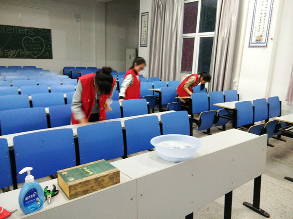 为给我系学生营造一个良好的学习和考试环境,同时增强学生爱护公物的意识,食环系志愿者分会暖风服务队的志愿者们于6月19日来到二号教学楼,主动承担起义务为各个教室里的课桌椅进行一次检修的任务。