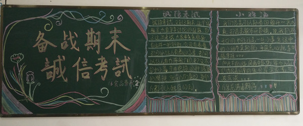 近期,我系团总支广泛发动学生绘制黑板报大力宣传诚信考试,号召学生排除外界干扰,积极备考。引导学生正确认识考试对评价自己的重要性,充分利用时间认真复习,满怀信心地迎接考试。我系倡导学生提高自身修养,以诚信的态度对待每一场考试,考出真实水平。考试时,要严肃考风考纪,端正学习与考试的态度,严格遵守考试规章制度,实事求是,杜绝一切考试作弊形式。要弘扬诚信正义,树立与不良风气作斗争的信心和勇气,勇于检举揭发考试作弊行为。