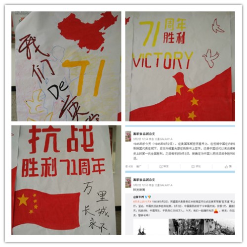 食品系学生会出制纪念抗战胜利71周年系列海报,在全系范围内进行广泛宣传,同时通过微博、微信平台向学生推送相关消息,营造浓郁的纪念氛围。