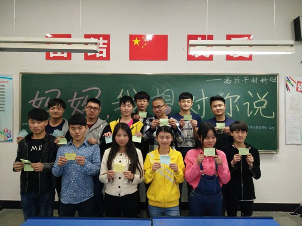 15食品营养班同学为远方的母亲折千纸鹤,写一封感情真挚的信;15园艺班同学唱起了母亲之歌,说起了自己与母亲之间的感人故事;15高分子班同学“为妈妈许愿”,征集“妈妈的美丽谎言”…… 活动现场气氛温馨感人,同学们纷纷通过打电话或发短信的形式表达对母亲的爱和思念。