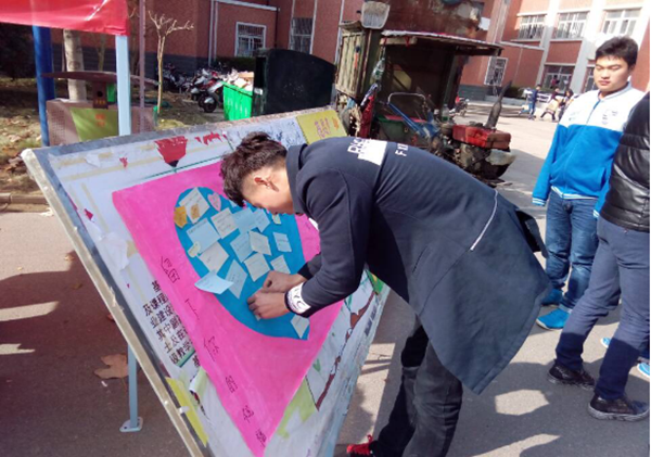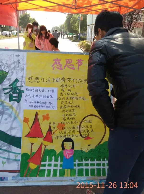 11月26日上午食品系花艺社办的“情系暖冬感恩主题活动在宿舍区展开。活动通过“远方的他(她)写一封信”、“送老师一支康乃馨”、“感恩留言墙”等形式,面向全院同学开展感恩教育。