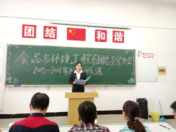 换届选举大会由学生会副主席刘娜主持。在主持人依次介绍候选人情况后,6名候选人分别发表竞选演说。他们身着正装、依次上台,表达愿为系部改革发展贡献力量的决心、畅想竞选成功努力开创工作新局面的宏伟志向,严肃认真却又不乏激情。演说结束后,在主持人的组织下,全场进行民主投票。最终,14高分子班张朗同学高票当选为食品系新一届学生会主席,14化工2班张文静同学、14食品班申伟同学当选学生会副主席。
