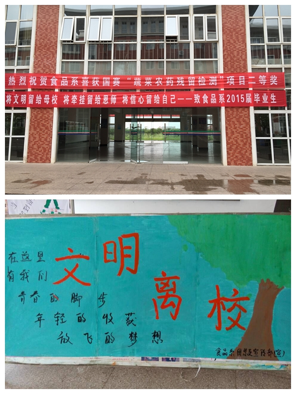 6月24日上午,食品系2015届毕业生工作会议在2219召开,党总支书记就毕业生工作做出了全面部署和具体要求。下午,团总支“文明离校”倡议海报摆到了教学楼大厅;至善楼则被“将文明留给母校,将牵挂留给恩师,将信心留给自己”的横幅装点的格外醒目。