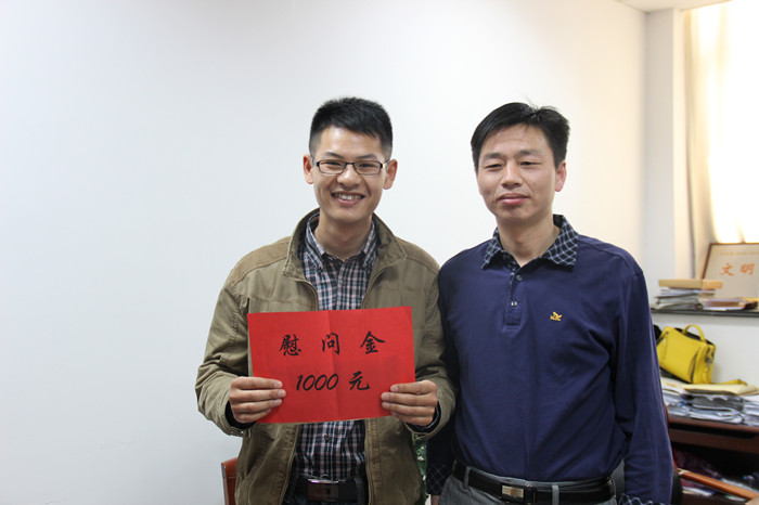 汪上认真听取汇报,在得知志愿者工作勤奋、坚持学习、取得较大进步时,他非常高兴,对定远县团委领导对志愿者工作的肯定与指导表示感谢,对志愿者自身的努力给予高度评价。他鼓励吕祥在今后工作中继续苦干实干,坚定理想信念,发扬艰苦奋斗精神,锤炼品质、奉献青春,在岗位上做出更大的贡献;要求学院团委时刻关注关心志愿者,努力创造条件,工作上多给予指导和支持;汪上还希望定远团县委领导能一如既往关心吕祥,多给他压担子、分任务,工作上多给予指导,同时希望定远团县委与学院共青团加强交流与合作,共同为滁州经济社会发展服务。最后,汪上代表学院为吕祥送上了1000元的慰问金。