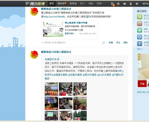在我国传统节日“清明节”之际,食品系团总支积极组织团学干代表参观爱国主义教育基地、号召广大团员通过网络祭奠革命英烈等,引导广大学生慎终追远、缅怀先辈,增进热爱祖国、热爱人民的情感,立足实际,为实现中华民族伟大复兴的“中国梦”而刻苦学习、努力工作。