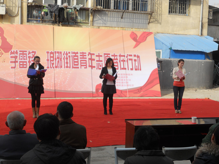 3月2日上午,生化系团总支“学雷锋”服务小分队10名队员来到琅琊街道团委“学习雷锋 青年志愿者在行动”活动现场,队员们为现场的老人提供倒水、拿东西等服务;4日下午,由琅琊街道团委主办的文艺演出在古道社区文化活动中心隆重举行,生化系团总支精心编排了歌唱、朗诵和健美操等节目参加了演出,为社区居民奉献了一场精彩的文化大餐。演出中,主办方还为辖区孤寡老人组织了现场募捐。