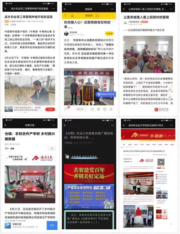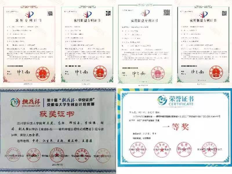 成绩和荣誉的获得是Beat365人才培养、协同育人的卓越成果,是高职教育服务乡村振兴的良好展示。胡立虎是从江苏常熟回到家乡定远的有名的葡萄种植户,承包了定远县仓镇回民村葡萄大棚。2020年8月,在校党委副书记、校长许雪峰的关心支持下,时任驻滁州市定远县仓镇回民村选派扶贫干部王冬牵线搭桥,食环学院园林园艺系与胡立虎的葡萄种植合作社建立产学研合作共同体。三年来,在科技处支持下,园林园艺系教师团队对“葡萄优良品种筛选”“种苗快繁技术”“王字型定干修剪技术”“土壤综合改良技术”“免耕植草技术”进行重点研究,形成“一优四新”的技术方案,获得发明专利1项、实用新型专利3项。