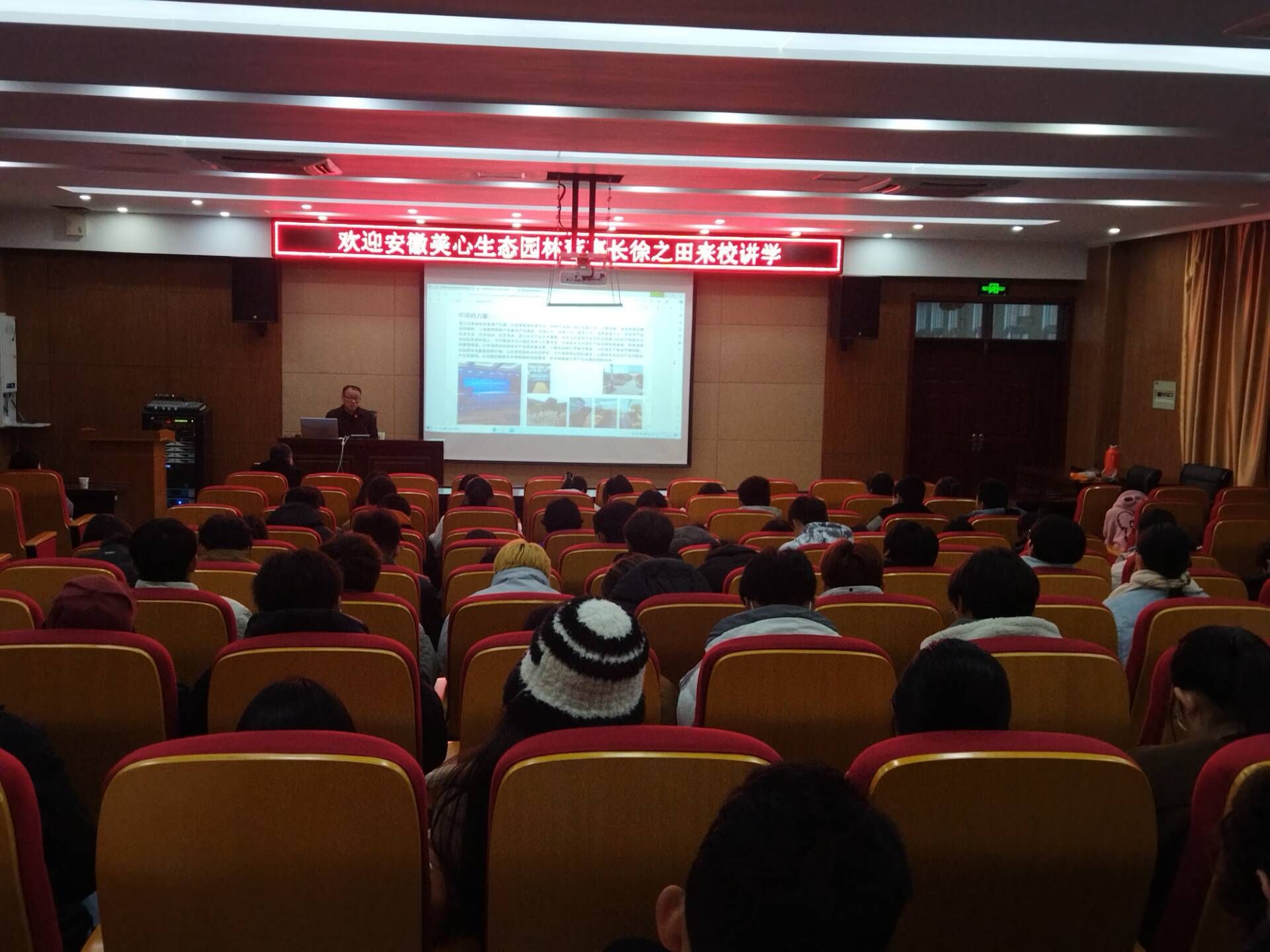12月14日下午,安徽美心生态园林有限公司总经理徐之田应邀到食品与环境工程学院开展学术报告。食环学院园林园艺系师生近180人共同聆听。报告会由梁建军院长主持。