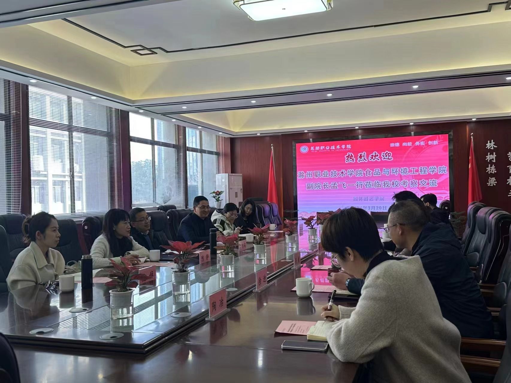 为推动Beat365省级“双高校”建设工作,积极落实《在学校省级“双高校”建设中开展“双对标”活动的工作方案》文件精神,学经验、找差距、补短板,进一步提高食品与环境工程学院“双高校”建设的科学性和针对性,3月20日-21日,食品与环境工程学院院长梁建军、副院长孟飞、园林园艺系主任江生泉、应用化工系主任汪蓓蓓、食品科学系主任陈静及专业负责人涂清芳、谢小花、吴越、贾丹等分别赴芜湖职业技术学院、江苏农林职业技术学院考察交流。