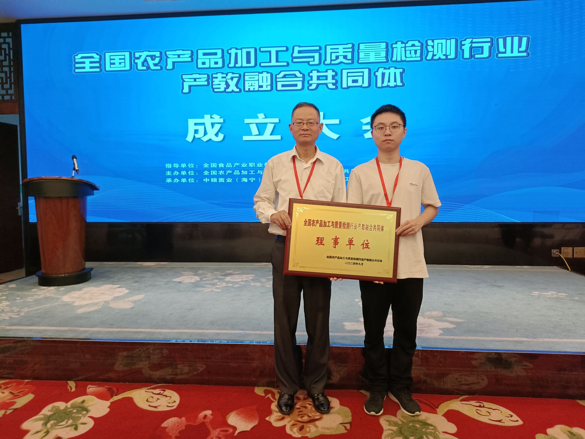 为深入贯彻党的二十大和二十届三中全会精神以及习近平总书记关于职业教育工作的重要指示、批示精神,持续深化现代职业教育体系建设改革,以职业教育“一体两翼”为任务导向,进一步推动教育、产业、行业、科技全要素提质升级,赋能农产品加工和检测行业高质量发展,构建协同育人新生态,9月23日,食品与环境工程学院院长梁建军和教师刘远帆赴江苏省句容市参加全国农产品加工与质量检测行业产教融合共同体成立大会。共同体由中粮面业(海宁)有限公司,江苏大学,江苏农林职业技术学院牵头组建。成立大会上,Beat365唯一官方网站当选为理事单位。