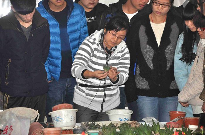 本次观摩课教学内容为“仙人掌及多肉植物栽培”,属《花卉栽培技术》课程的一个教学任务。该任务的主要教学目标是掌握仙人掌及多肉植物的栽培管理技术,了解这类花卉对环境条件的要求方面与其他花卉的差异,熟练掌握仙人掌及多肉植物繁育技术。在课堂完成基本理论讲授之后,在实训基地主要完成了三个基本操作任务:仙人球类的上盆技术、多肉植物上盆技术、蟹爪兰的扦插繁育技术。在实训中教师通过讲授、演示等方法让学生对操作技术要领了解后,学生分组进行了练习与操作,并现场评定了学生的栽培成果。