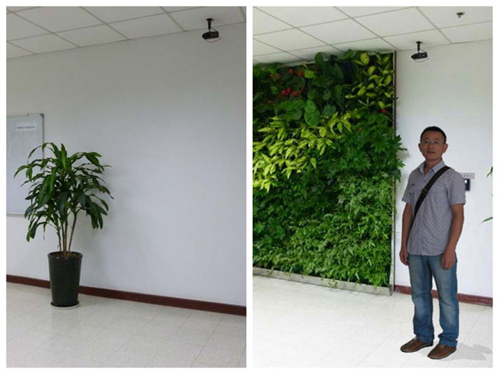 在暑假期间,汤老师在该公司负责人之一刘德光的安排下,从①墙面勘测(除了长、宽、面积外还需对墙面材质进行勘测);②涂刷高强防水粘合涂料(根据墙面材质分析选择不同防水剂涂料);③供水系统的设计安装(循环滴管);④植物的种植(目前多采用营养钵、花箱等种植技术);⑤测试设备、工完清场;⑥后期养护等环节详细了解学习。