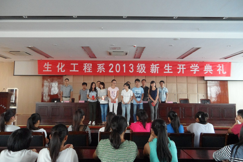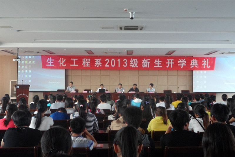丹桂飘香,金秋送爽。9月9日上午8:30,生化工程系2013级新生开学典礼在综合楼五楼报告厅隆重举行。会议由孟飞老师主持。副书记苏和堂、副主任梁建军、辅导员吴剑安老师、和小岗食品企业代表等出席该典礼。