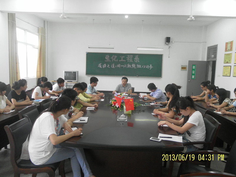 6月19日下午四点半,,生化工程系在2317会议室召开了以“成功之道:用100%的激情,做1%的事”为主题的座谈会。参加会议的有系党总支副书记苏和堂、王磊老师、系团总支和学生会部分主要学干。