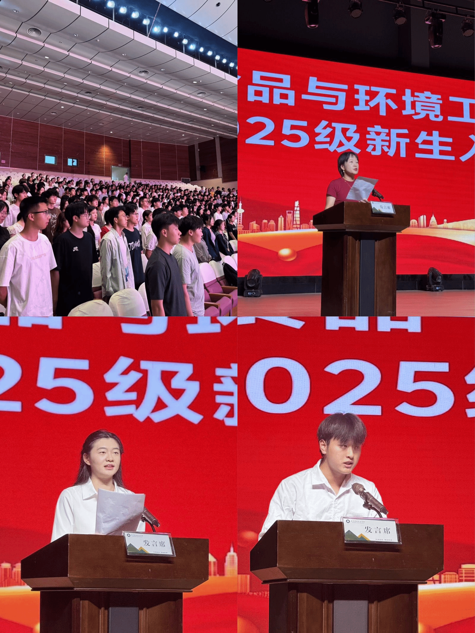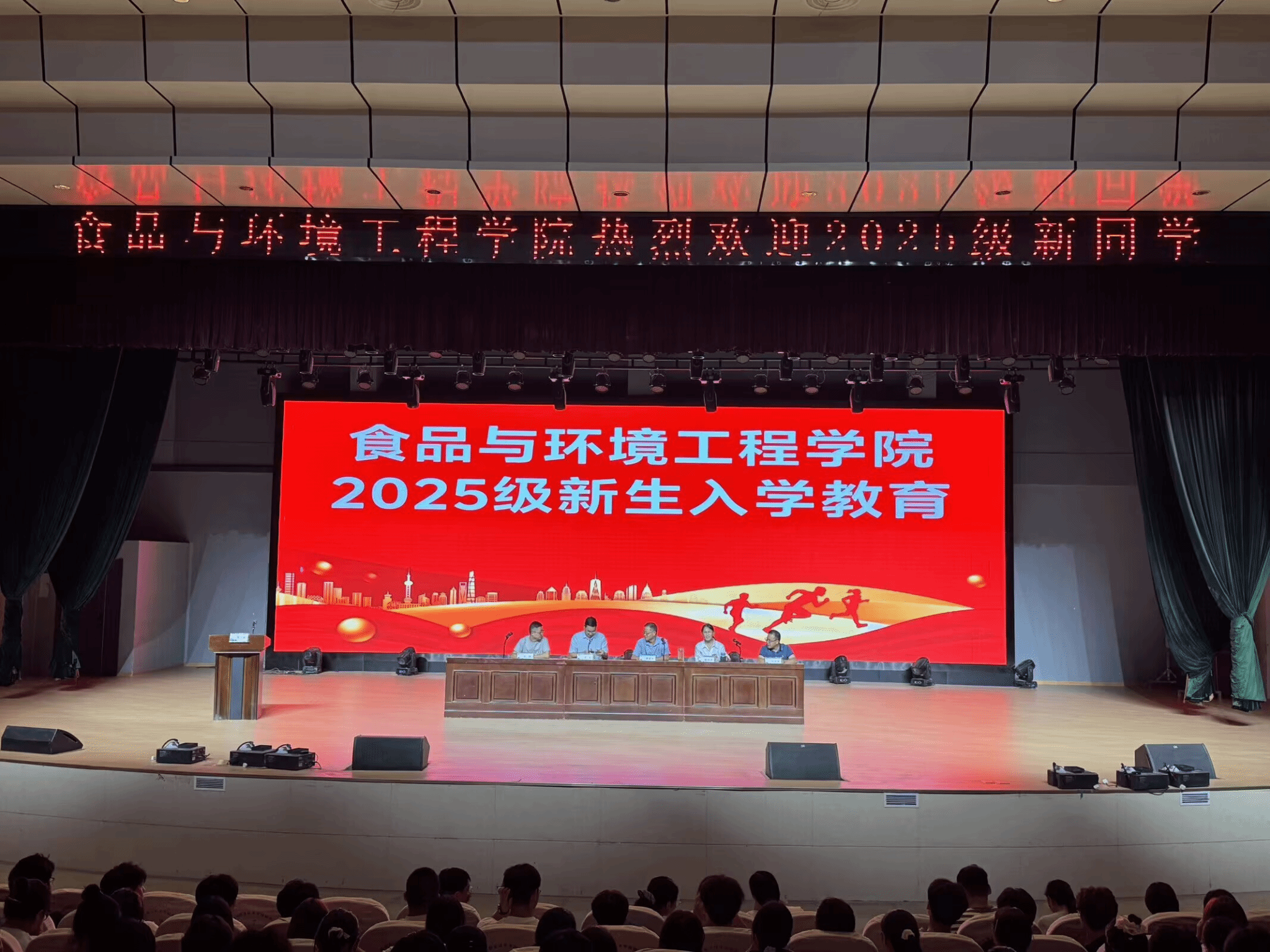 金风送爽,逐梦启航。2025年9月9日下午3点,食环学院在校大礼堂举办了2025级全院新生入学教育大会。院长梁建军教授,党总支书记张功会、副书记江生泉,教学秘书王磊老师、25级新生辅导员及新同学共同参与,仪式由学院副院长孟飞主持。