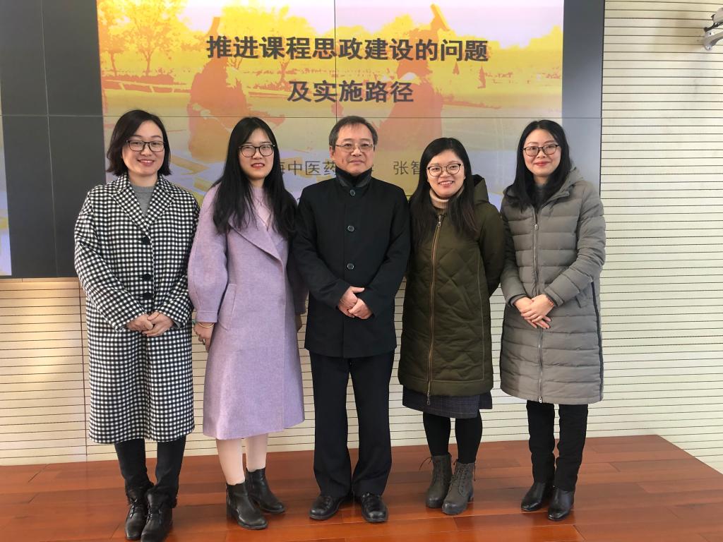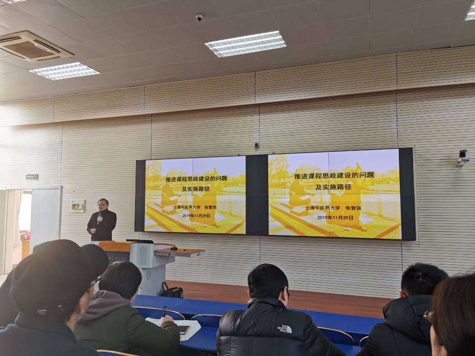 上海中医药大学书记张智强教授为老师们做了精彩的培训,培训会上,张教授就课程思政教学内容的设计与实施做了示范和讲解。张教授首先以“课程思政是什么”、“思政教育与专业教育是什么关系”、 “专业课程中的思政教育讲什么”几个问题开场,层层递进,与老师们探讨了课程思政的可行性、有效性;实施途径和方法;初心、要求和意义几个方面的问题。同时以家国情怀、个人修养、科学观等思政元素为例,将历史渊源、行业内典型人物事迹、时事新闻与社会现象等与专业知识、专业技能、专业精神相结合的思政元素融入专业课程,并以《人体解剖学》《土木工程概论》等课程思政为例进行思政元素的分析。