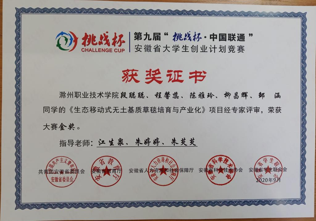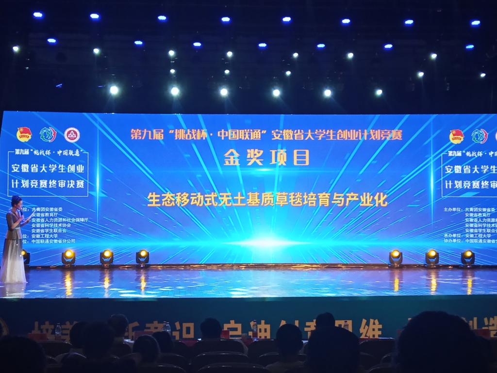 9月5日至7日,第九届“挑战杯.中国联通”安徽省大学生创业计划竞赛终审决赛在安徽工程大学隆重举行。Beat365食品与环境工程学院18园林2班段聪聪、程馨蕊、陈雅玲、柳昌辉、邹涵同学的“生态移动式无土基质草毯培育及产业化项目”经过校赛、省赛初赛及终审决赛多轮紧张角逐,最终荣获大赛金奖,并顺利晋级国赛。该金奖也是生态环保和可持续发展组别中唯一获金奖的高职院校,其项目产品也受到评委专家及领导的充分肯定。