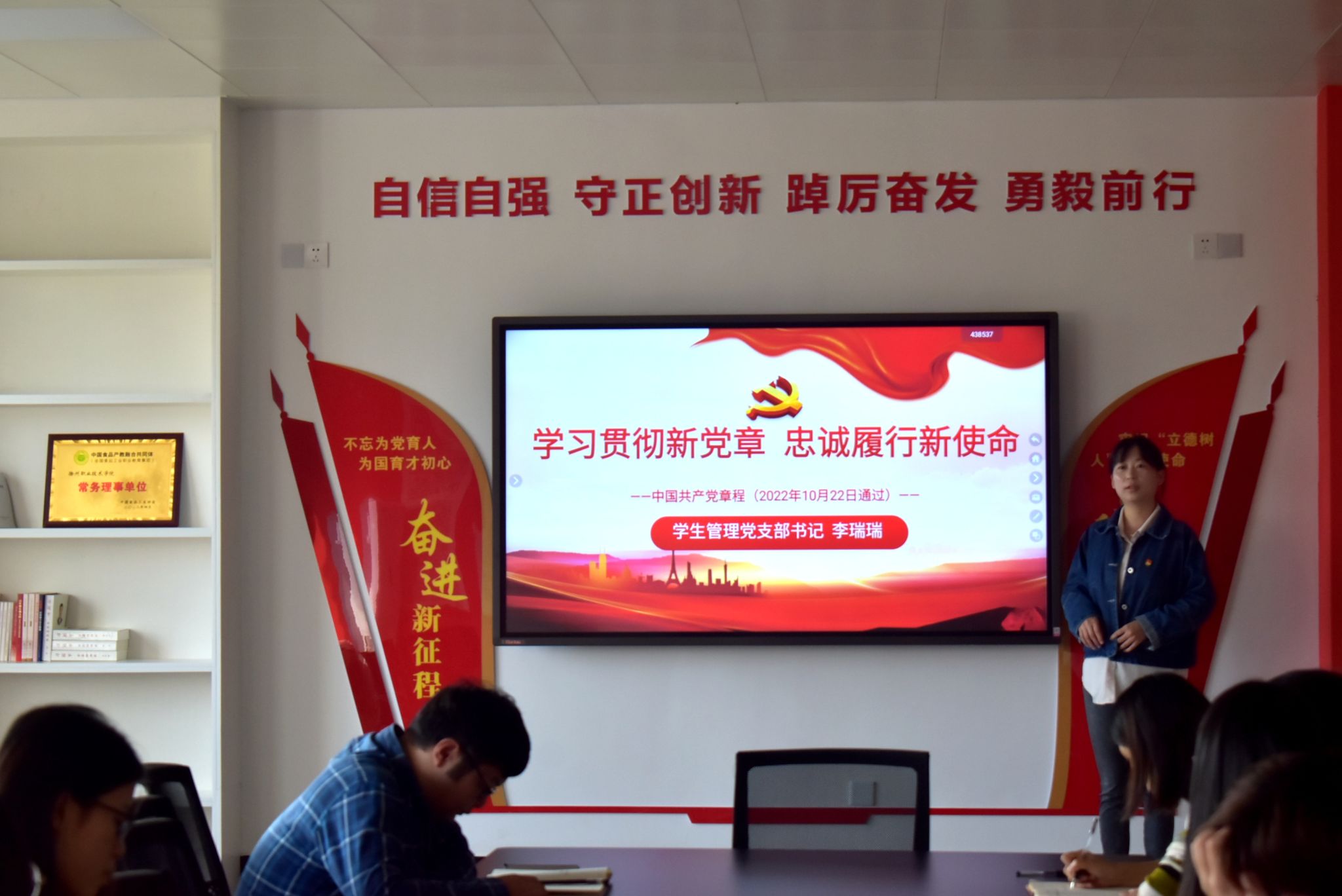 为深入学习贯彻党的二十大精神,持续推进学习贯彻习近平新时代中国特色社会主义思想主题教育走深走实,引领带动广大党员以学铸魂、以学促干,10月11日下午,食环学院学生管理党支部书记李瑞瑞在2317会议室为全体党员讲授题为“学习贯彻新党章 忠诚履行新使命”的党课。
