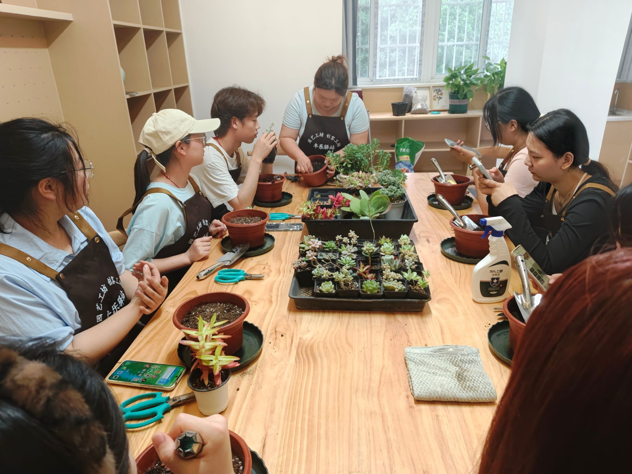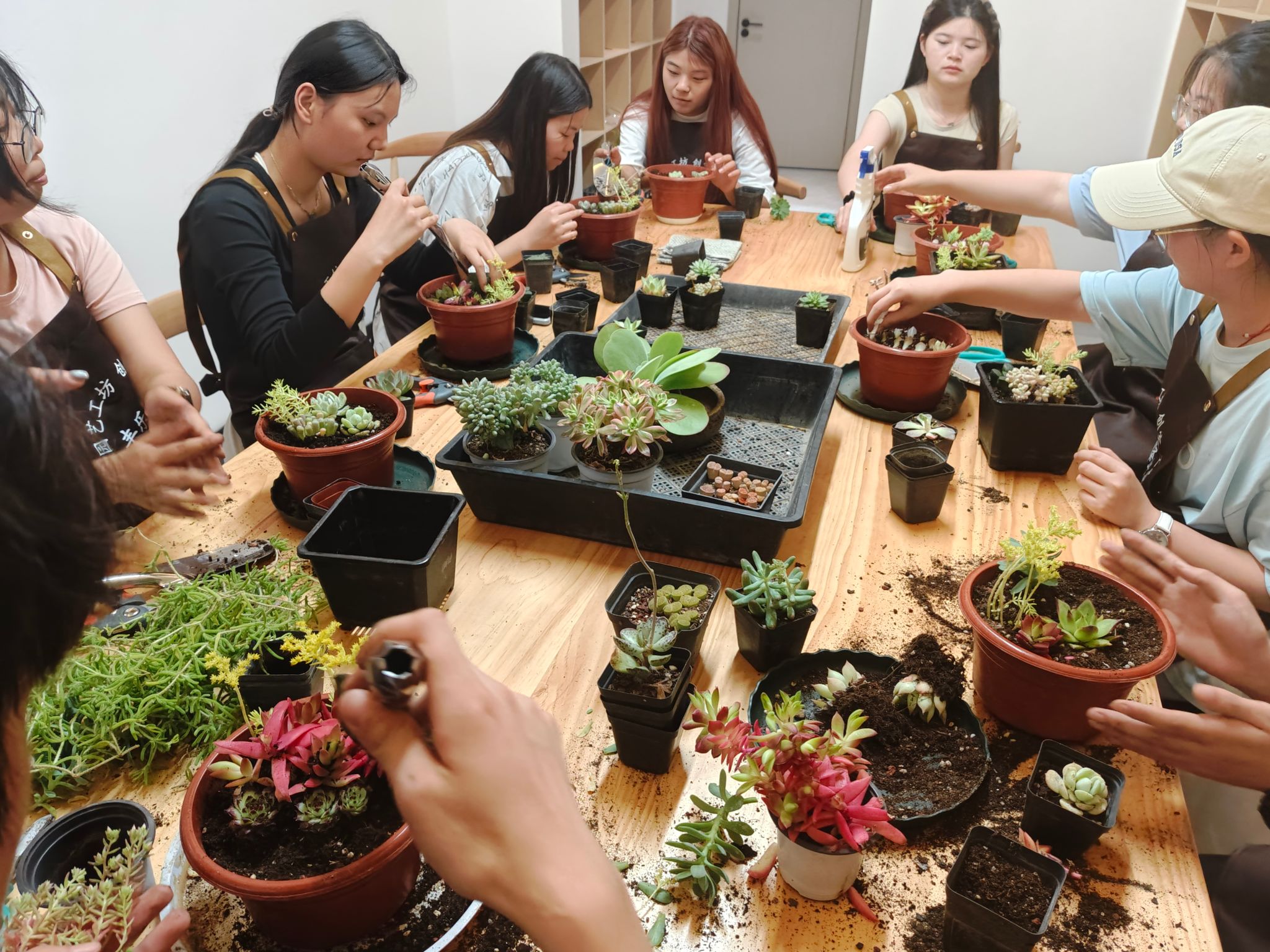 实践环节,同学们精心挑选心仪的多肉品种,从修剪枝叶到调配土壤,用心完成每一道工序。大家一边学习一边交流互助,现场气氛轻松愉悦。绿意盎然的植物一盆一盆增多,既点缀了空间,又让大家的心境变得宁静舒畅。