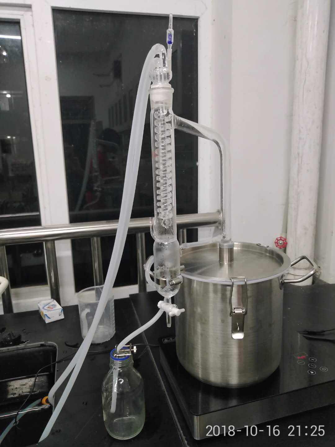 纯露制作过程简单,只需把新鲜或经干燥处理的植物材料,放进蒸汽热熔炉中,利用水蒸汽将挥发较强的植物芳香精油携带出来,使之形成含有精油的水蒸气状态,在通过冷冻箱的导管,利用温差冷凝成液体状态,从而分离除纯露水。