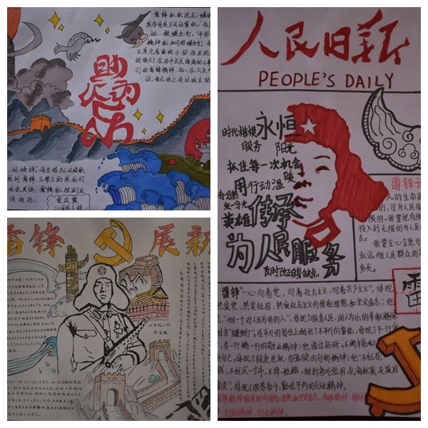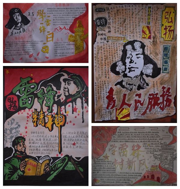 活动过程中,同学们通过笔墨、书画在手抄报作品中汇入了大量的雷锋奉献事迹和奉献精神金句,极大的增强了学生们对雷锋精神的理解,深刻的把握了雷锋精神的时代内涵和实践要求。各班既学习雷锋的精神,又学习雷锋的做法,还对雷锋同志的生平事迹进行全方位宣传,赞扬雷锋的“钉子精神”,歌颂雷锋“全心全意为人民服务”的高尚品质。