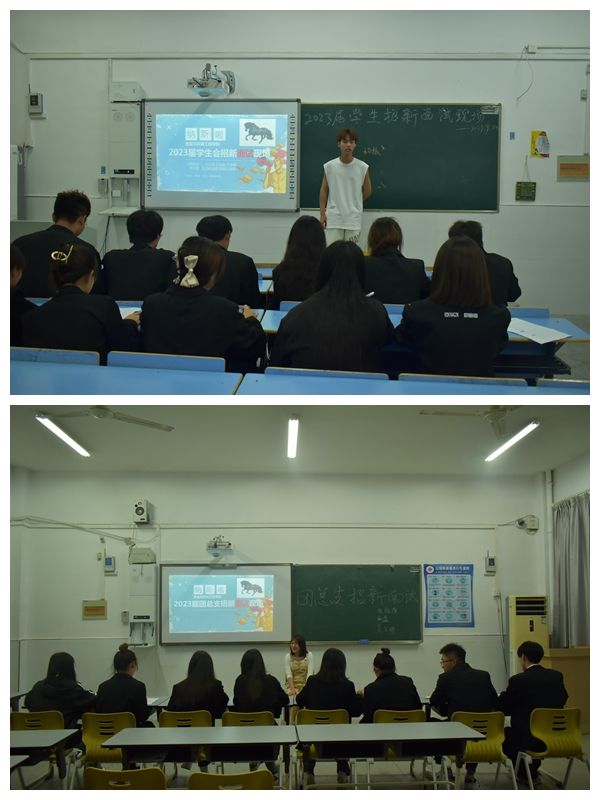 此次招新面试主要分为自我介绍和现场提问两个环节。在自我介绍环节,面试者从个人基本情况、工作经历、优势特长等方面逐一进行自我介绍,充分展现自己的才能。各部长根据其部门的工作性质提出相应问题,考验他们的临场发挥能力与应变能力。面对提问,同学们沉着冷静应答,从容而自信,言谈举止中流露出对参与团学工作的期待及锻炼自我的决心,展示出了新一届大学生努力向前的勇气和积极向上的风采。