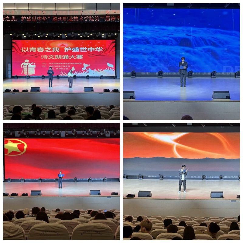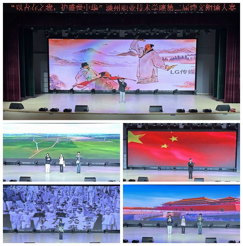 此次大赛以学院为单位,自选篇目进行展示,旨在通过朗诵经典诗文,让学生们感受中华文化的博大精深,激发他们对文学艺术的热爱,同时也是对学生综合素质和表达能力的一次全面展示。比赛中,参赛同学们姿态大方,伴着优美的配乐或慷慨激昂,或深情款款,《盛世中华》《我骄傲,我是中国人》《大写的中国》等朗诵节目抒发了同学们对祖国母亲的深深热爱,进一步诠释了“青春心向党,建功新时代”的铮铮誓言。