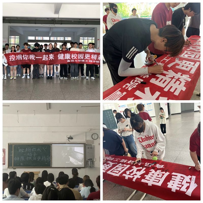 为提升学生对吸烟危害的认知,营造健康和谐的校园环境,做到积极宣传,远离烟草带来的危害,主动参与到戒烟控烟的活动中来。近日,食环学院团总支组织成员在2号楼大厅开展以“控烟你我一起来,健康校园更精彩”主题活动。