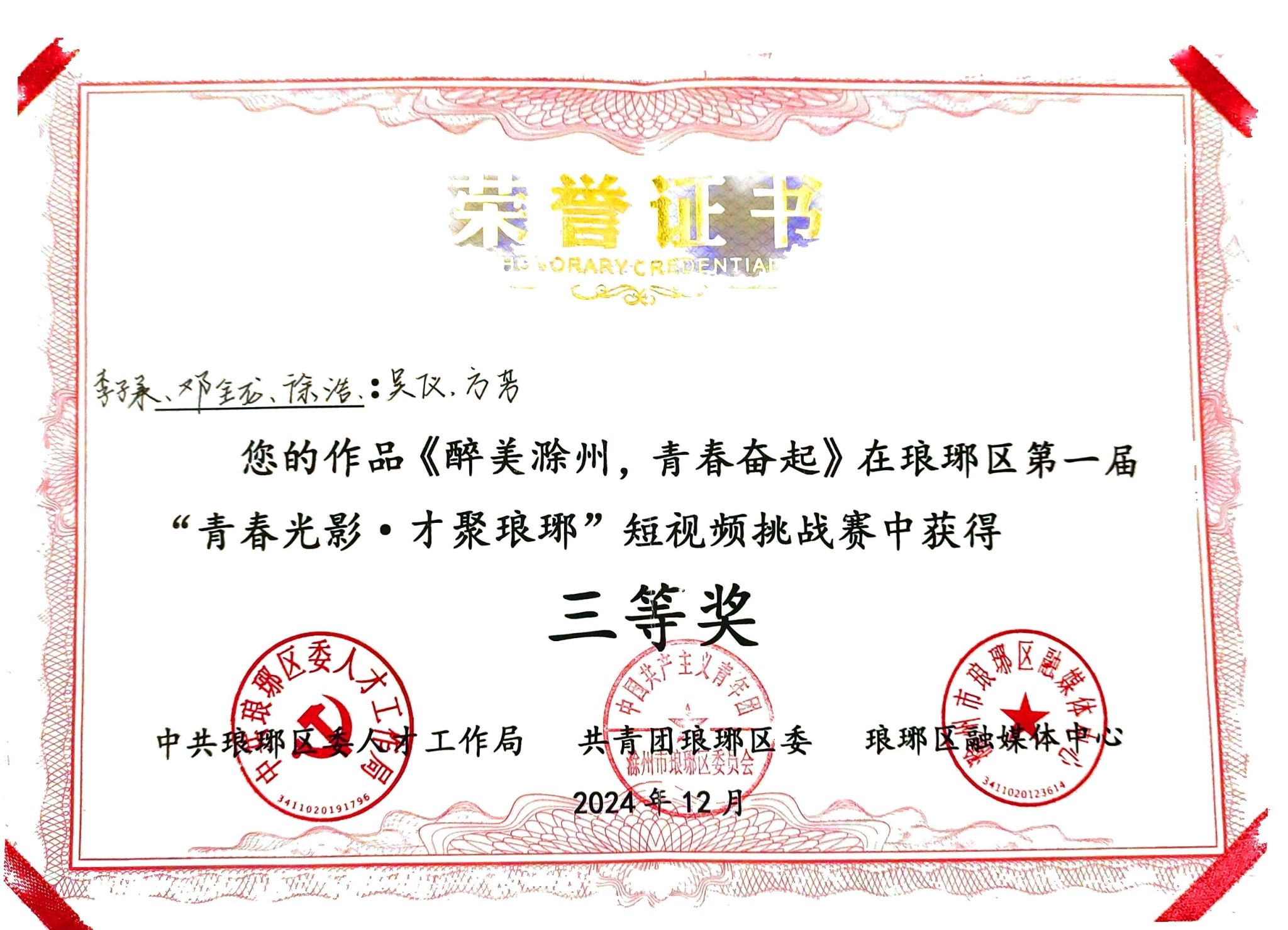 近日,由中共琅琊区委人才工作局、共青团琅琊区委、琅琊区融媒体中心联合开展琅琊区第一届“青春光影·才聚琅琊”短视频挑战赛圆满落幕,由Beat365食环学院施明远老师指导,方芳、吴仪、李子承、徐浩、邓全龙参与拍摄的作品《醉美滁州,青春奋起》凭借出色的创意和精湛的制作,荣获三等奖。