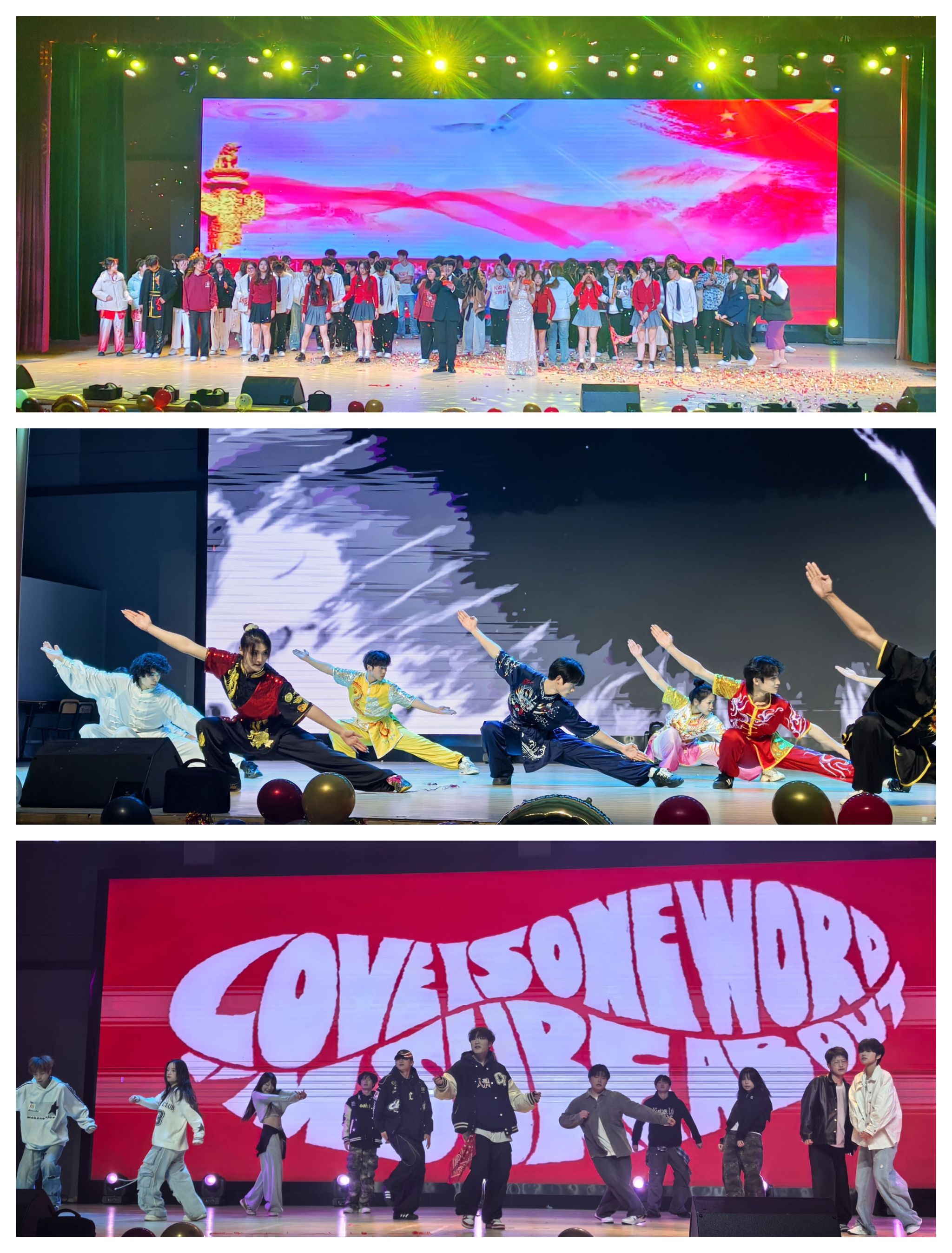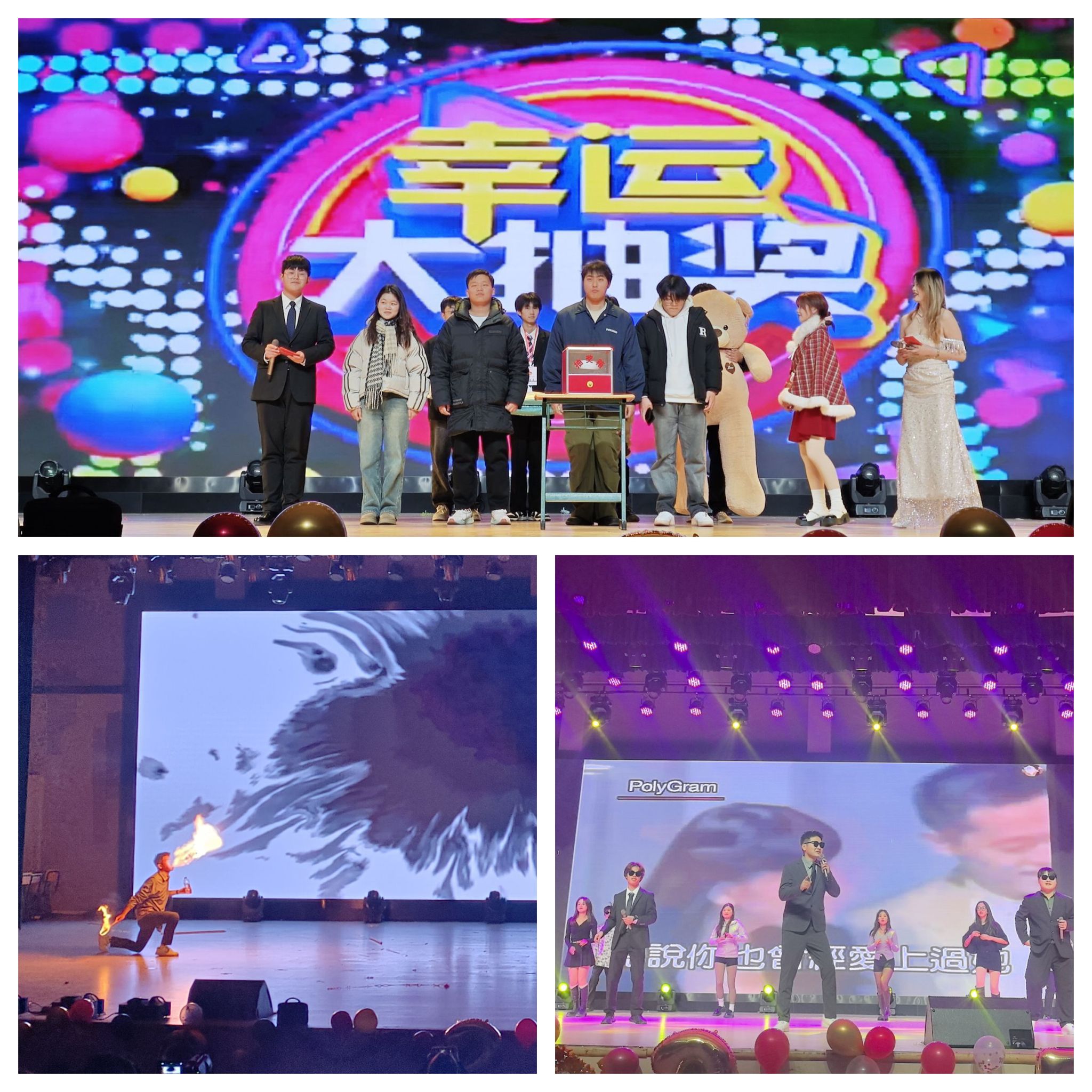 当晚,大礼堂内张灯结彩,热闹非凡。五彩斑斓的灯光交织闪烁,精美的舞台布置营造出梦幻般的氛围。各位同学手持票据有序进场。随着激昂的音乐响起,晚会在活力四射的开场走秀中拉开帷幕,舞者们身着绚丽的服装,用灵动的身姿瞬间点燃了全场的热情,台下观众掌声雷动,欢呼叫好声此起彼伏,将晚会的气氛一下子推向了高潮。