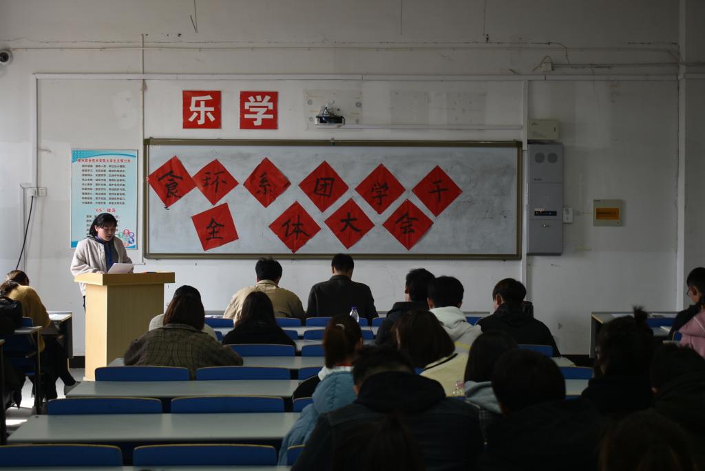 指导老师张功会最后发言。她说青年是最具有活力、热情和责任感的群体,经过上一个学期的考验和锻炼,食环系团学干队伍一定可以胜任新学期工作;希望各级组织以“全心全意为同学服务”为己任,凝聚青年,珍惜现有平台,在食环系大家庭中茁壮成长,有所收获。