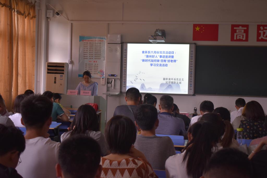 为进一步发挥身边好人和道德模范的典型示范作用,引导系部师生积极传承先进典型的正能量,食环系党总支联合民盟职院支部于6月12日下午组织开展6月党员活动日—“滁州好人”事迹宣讲暨“新时代如何做‘四有’好老师”学习交流活动。活动邀请了“滁州好人”薛扬萍老师做好人事迹宣讲及交流,食环系全体教师、部分学生代表及民盟职院支部全体盟员参加了此次活动。