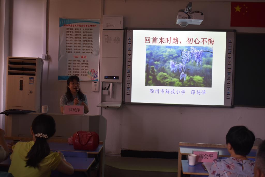 此次活动由党总支组织委员周玲玲副教授主持,分两个环节进行。首先由薛扬萍老师作好人事迹宣讲。薛扬萍老师是滁州市解放小学英语教师,琅琊区政协委员,任教30年间她在教学岗位上兢兢业业、辛勤耕耘、默默奉献,因劳累过度导致嗓子失声和神经性耳聋,无奈暂别英语课堂,但仍坚持在其他岗位上,是全校公认的爱岗敬业好老师,先后被评为琅琊“敬业奉献”好人、“滁州好人”。薛扬萍老师与在场师生分享了她工作以来的教学感受及教学经验,30余载不忘初心,表现出对党的教育事业的执著追求和无私奉献精神。