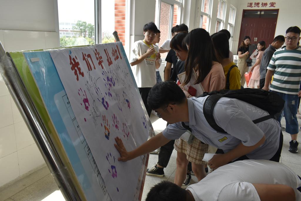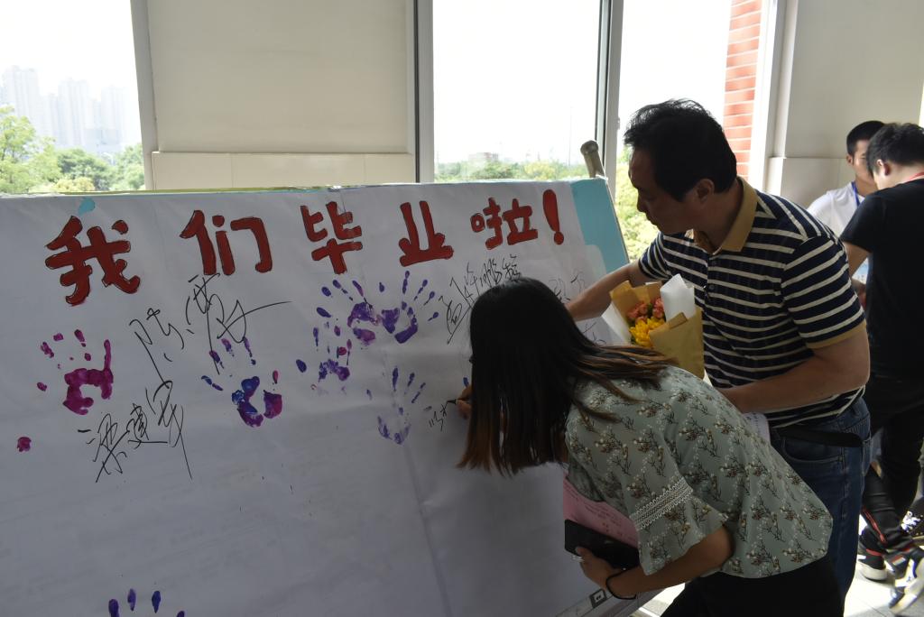 食环系党政领导、辅导员、教师代表与学生们欢聚一堂,师生一起在“我们毕业了”主题展板上签名、按手印,写下温暖祝福,并合影留念。
