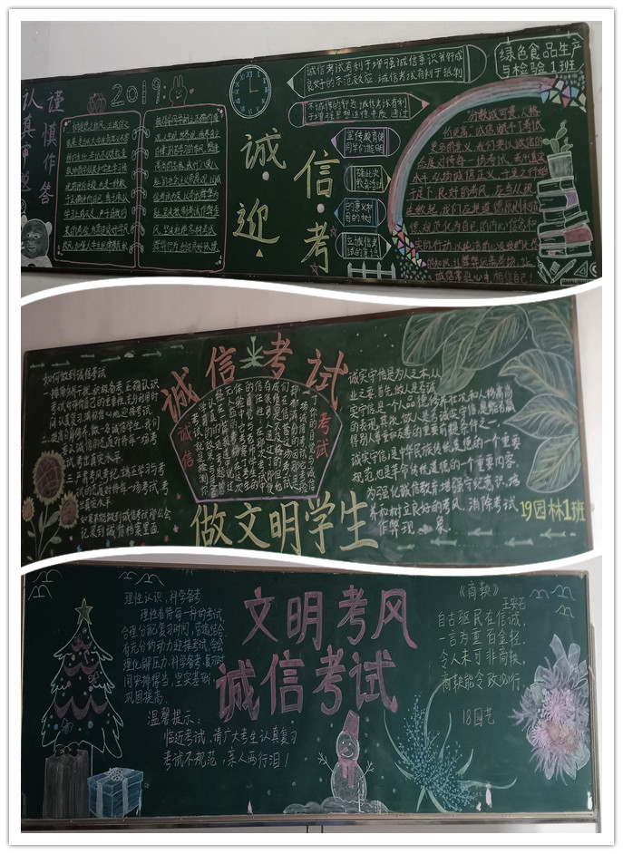各班委带领班级同学利用课余时间认真设计板报内容,紧扣“诚信迎考”主题、内容丰富、排版清晰,体现出了各班级的特色,同时表达了他们认真复习、诚信考试的决心。