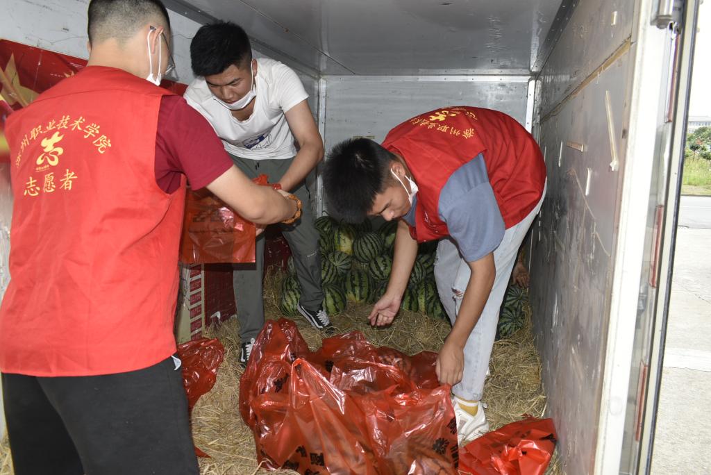 在校工会和王冬主任的指导下,西瓜销售工作在2号楼大厅有条不紊展开。团总支安排了7名青年志愿者帮助农户搬运西瓜、分装打包、登记刷卡,分工会主席江生泉老师全程协助。