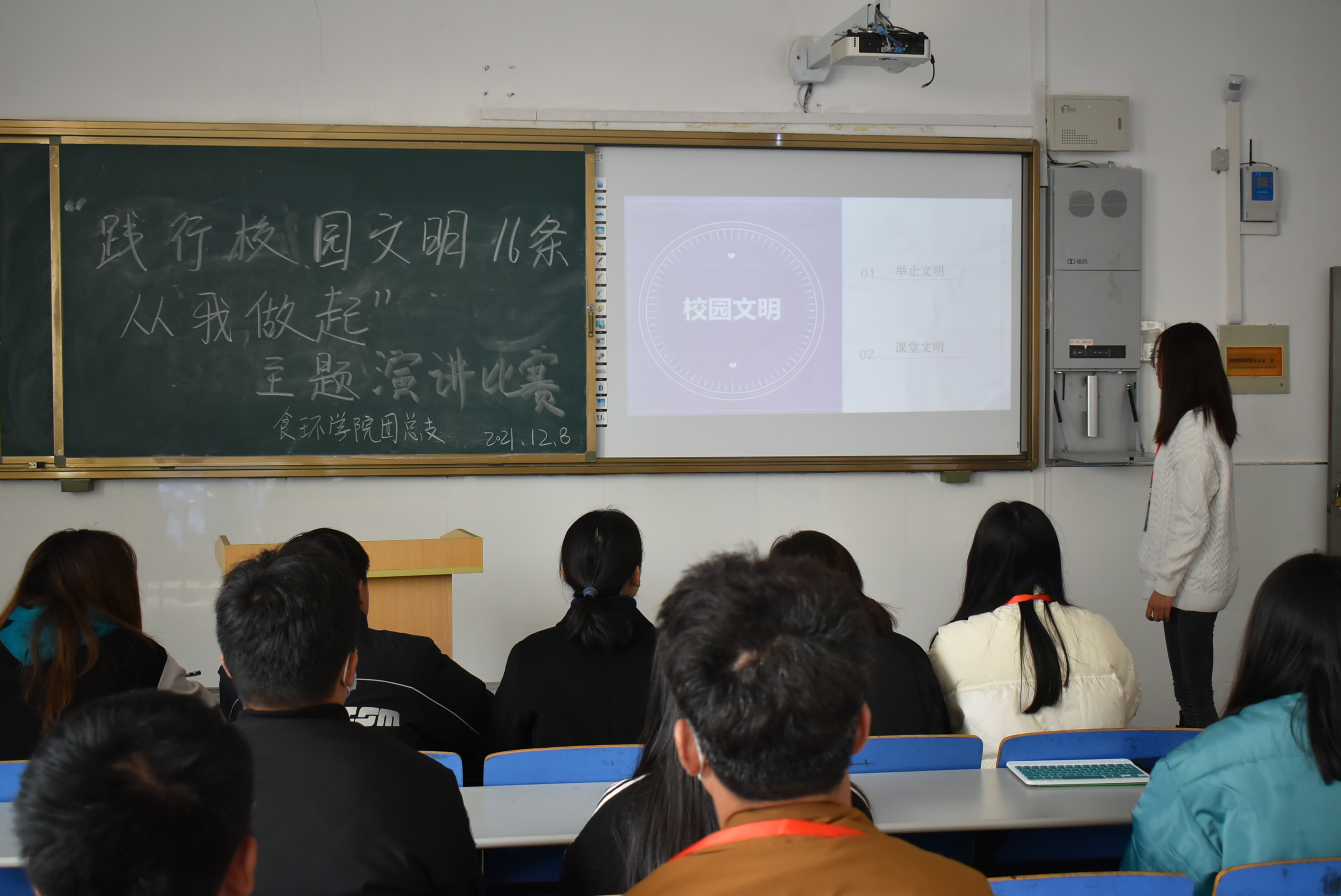 为进一步贯彻校园文明16条,培养我院学生良好的文明素养、加强院风学风建设,12月8日中午,食环学院团总支在致善楼2113室组织开展“践行校园文明16条 从我做起”主题演讲比赛。