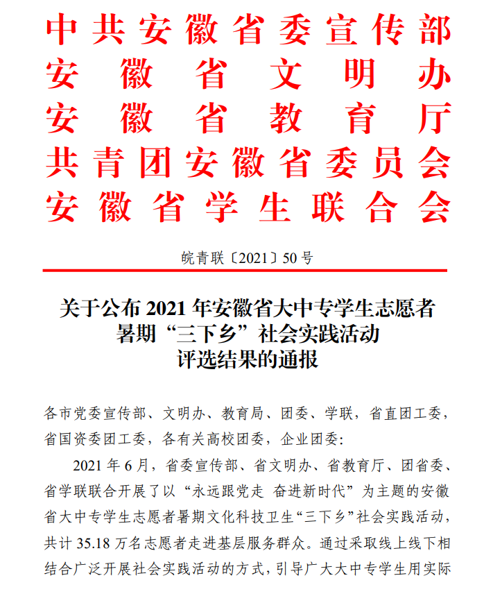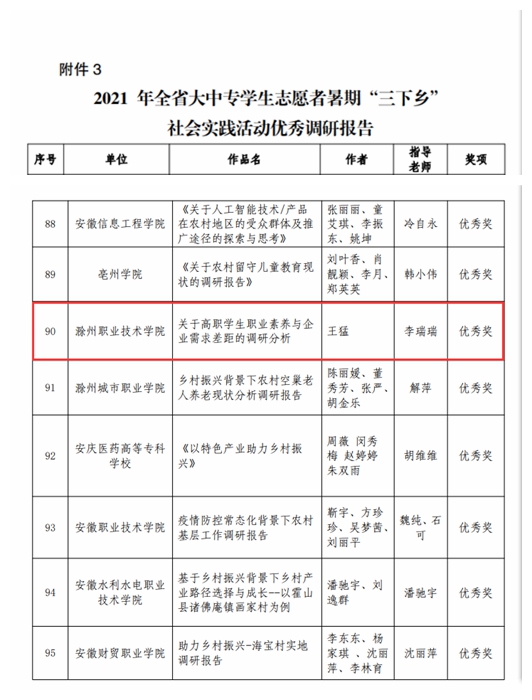 近日,团安徽省委对2021年安徽省大中专学生志愿者暑期“三下乡”社会实践活动中表现突出的集体和个人进行通报表扬,由食环学院团总支李瑞瑞老师指导、王猛同学撰写的社会实践调研报告《关于高职学生职业素养与企业需求差距的调研分析》获评“优秀调研报告”。